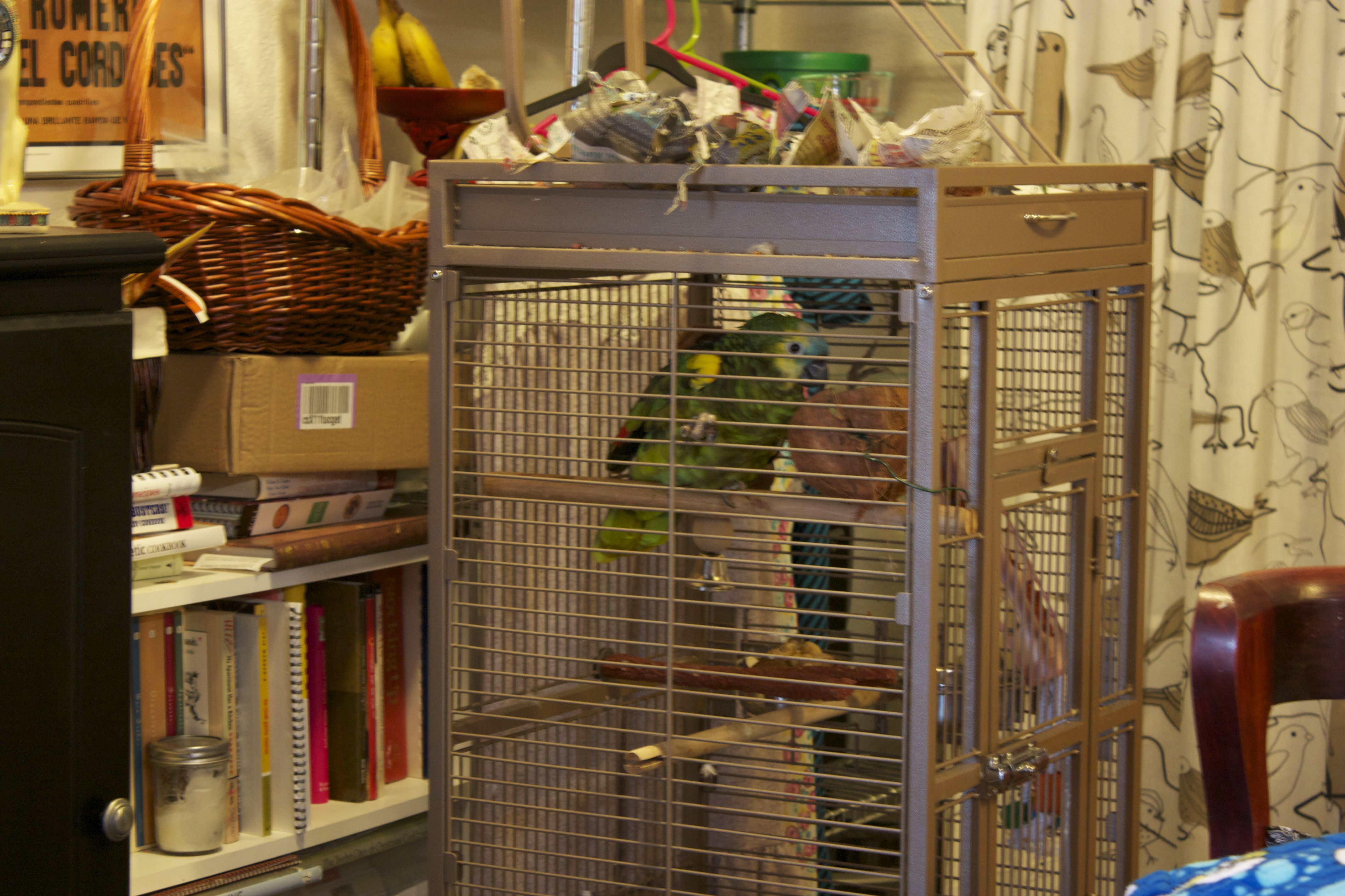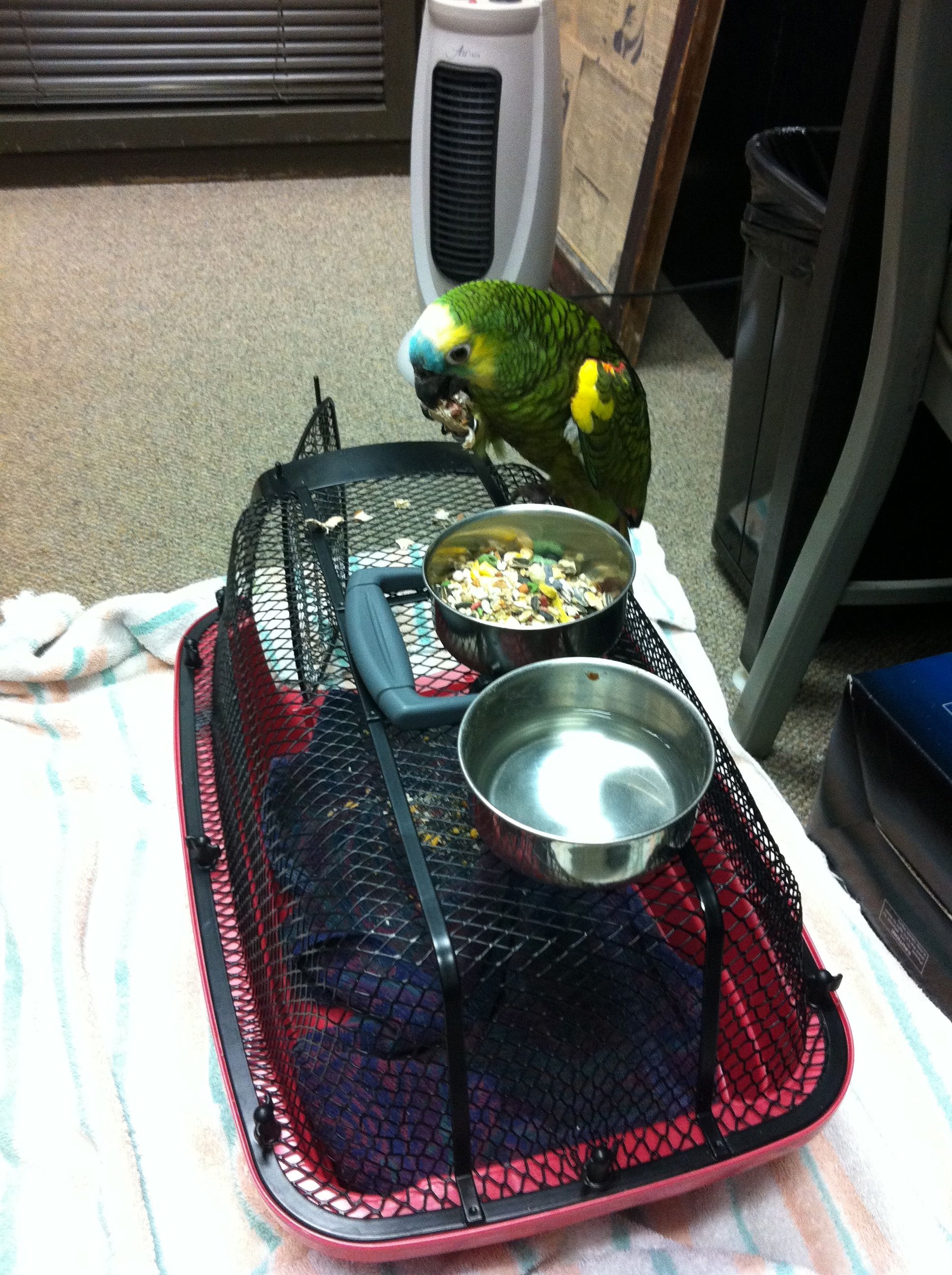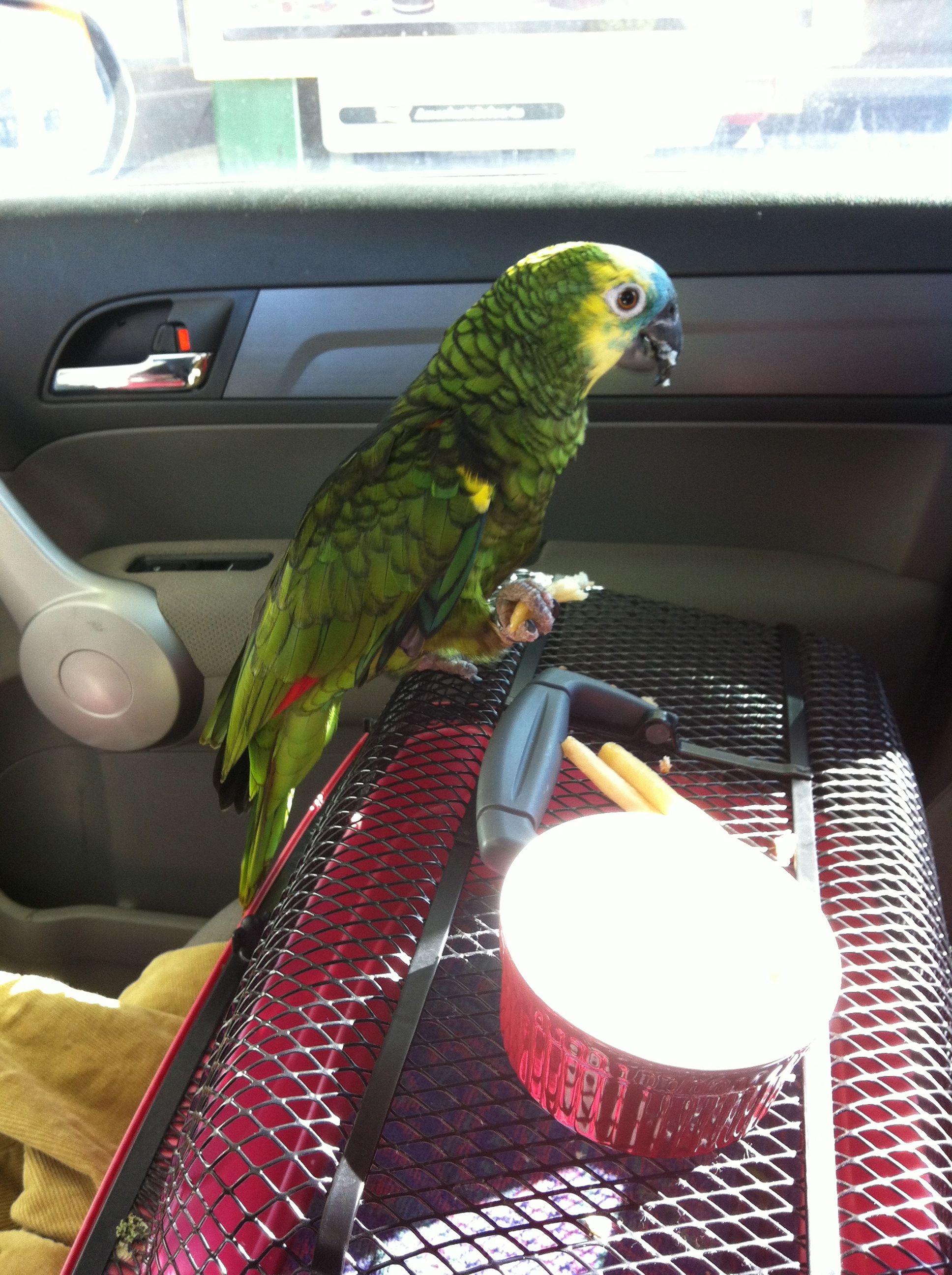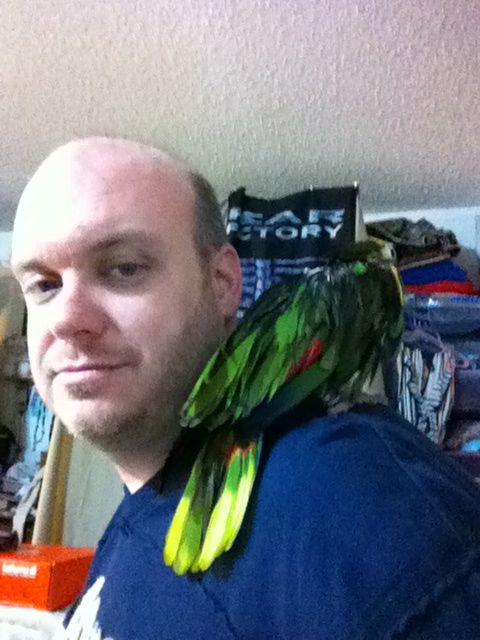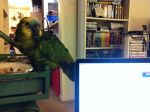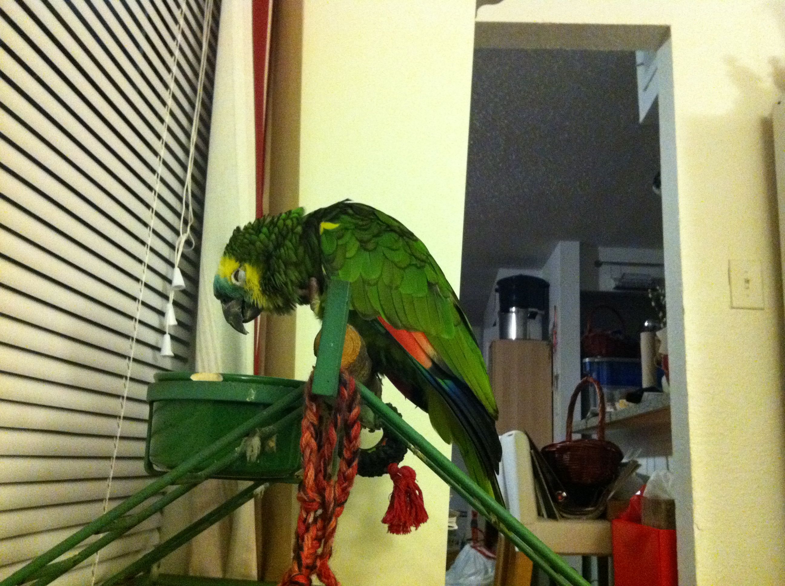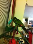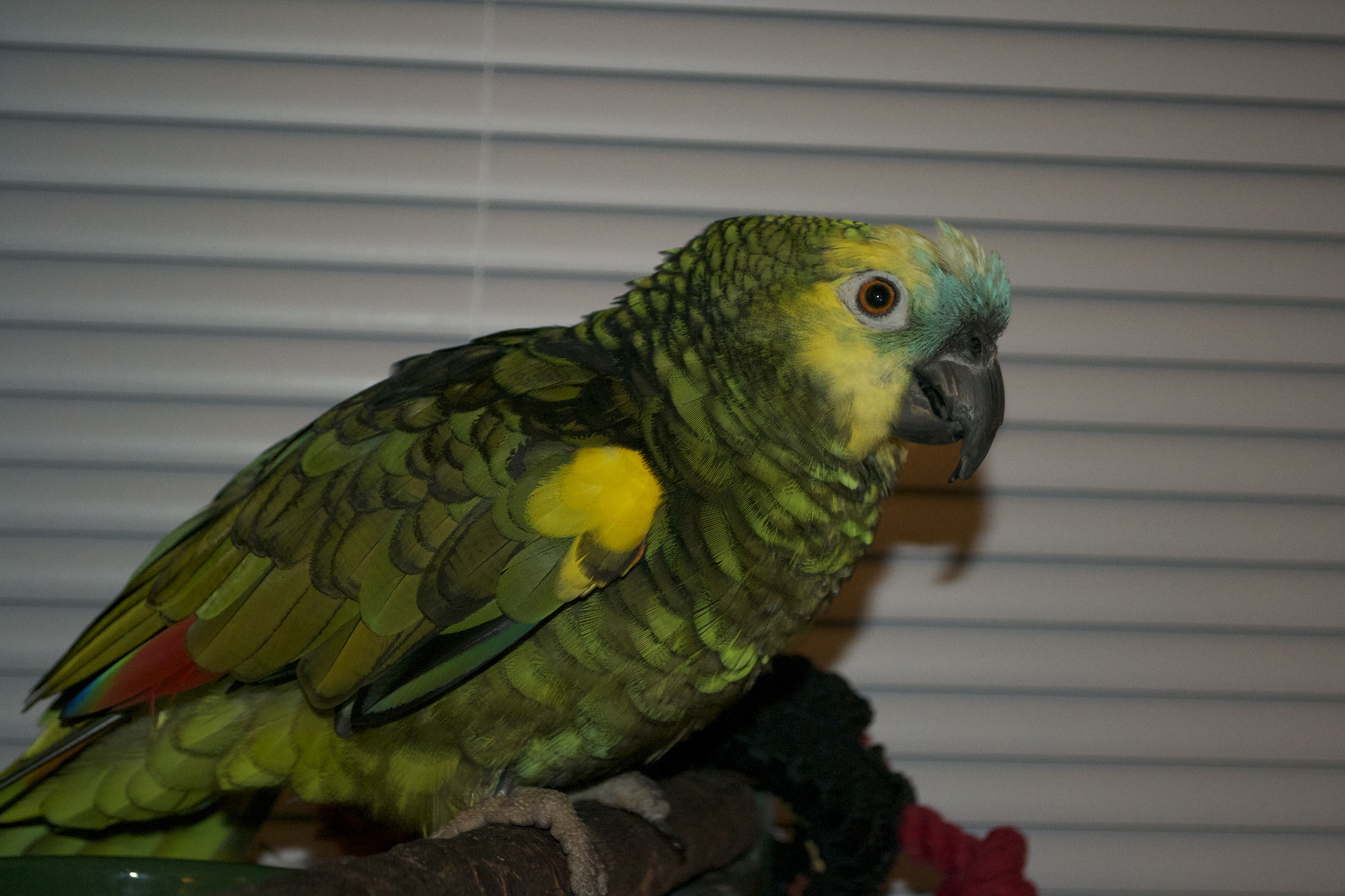 So, not doing any education stuff today, so I thought I would upload pictures of our parrot. Her name is Frankie, and she is a 24-year-old blue-fronted Amazon parrot. She was bought in 1988, and has lived mostly with my wife’s family until we adopted her last year. She doesn’t speak a whole lot, outside of occasionally saying, “I love you” and “hello.” Beyond that, she can make noises that are entertaining and sometimes loud, but compared to a lot of birds I’ve seen, she is quite quiet. She is missing most of her toes on her left foot, so she is not very steady anymore, but she seems to have adapted well. As we’ve had her, she has slowly become my parrot, as I have read they tend to do. They slowly bond with a single family member, unfortunately becoming somewhat hostile to others, so we have to be careful. Anyway, here are a few pictures to tide you over until next time.