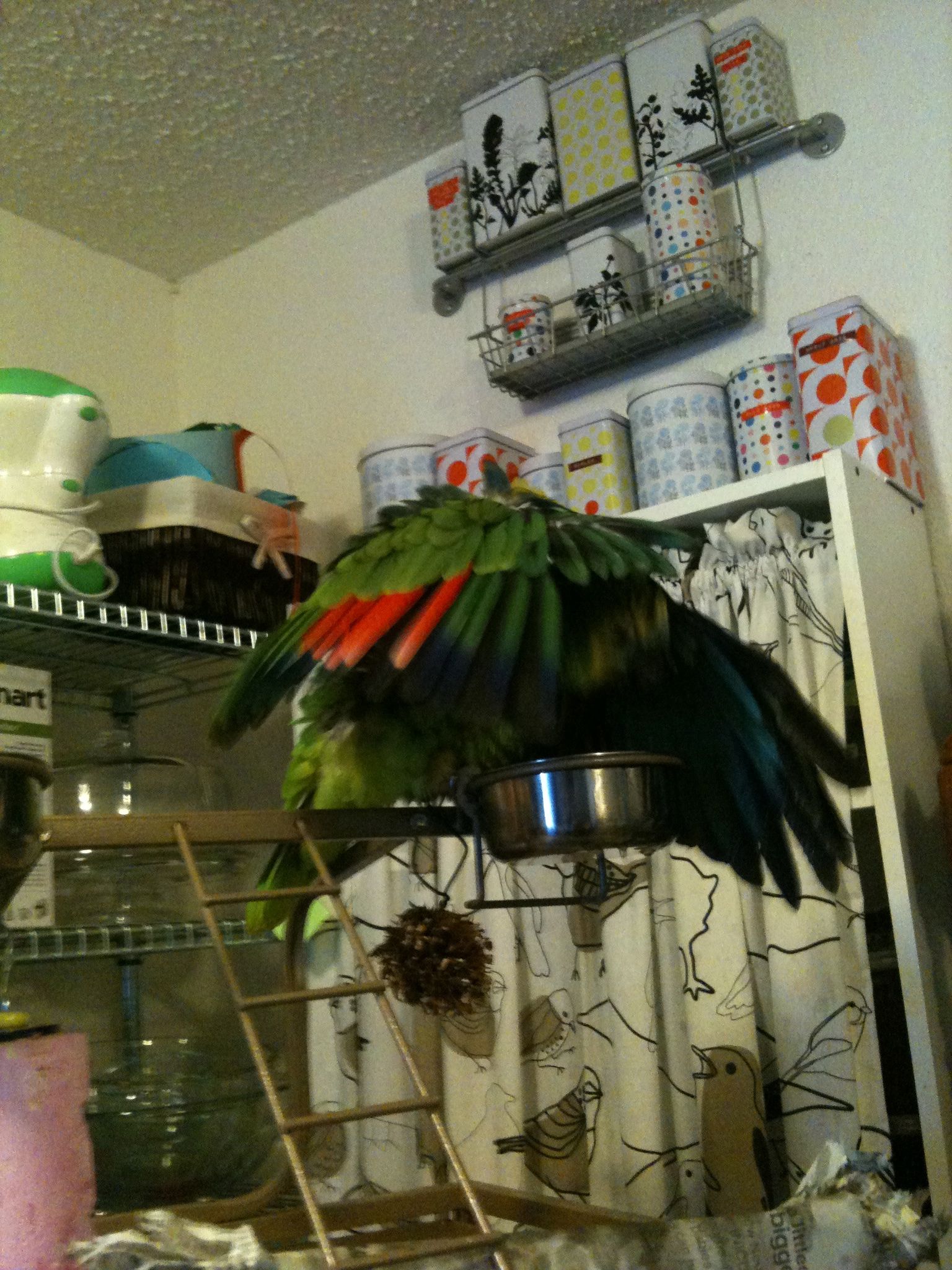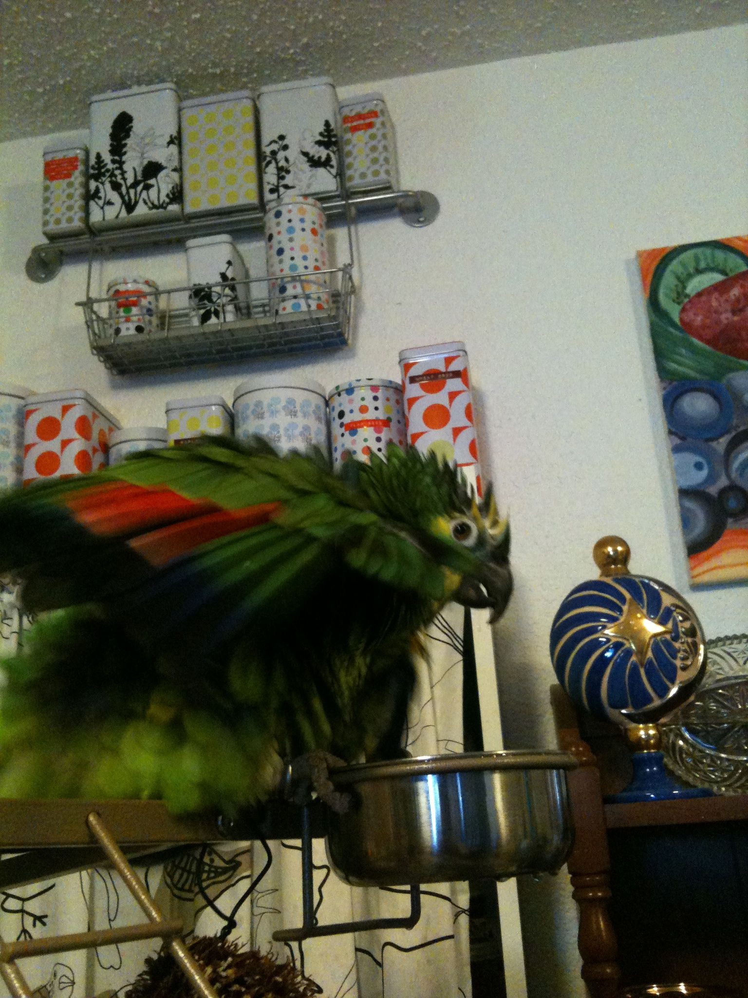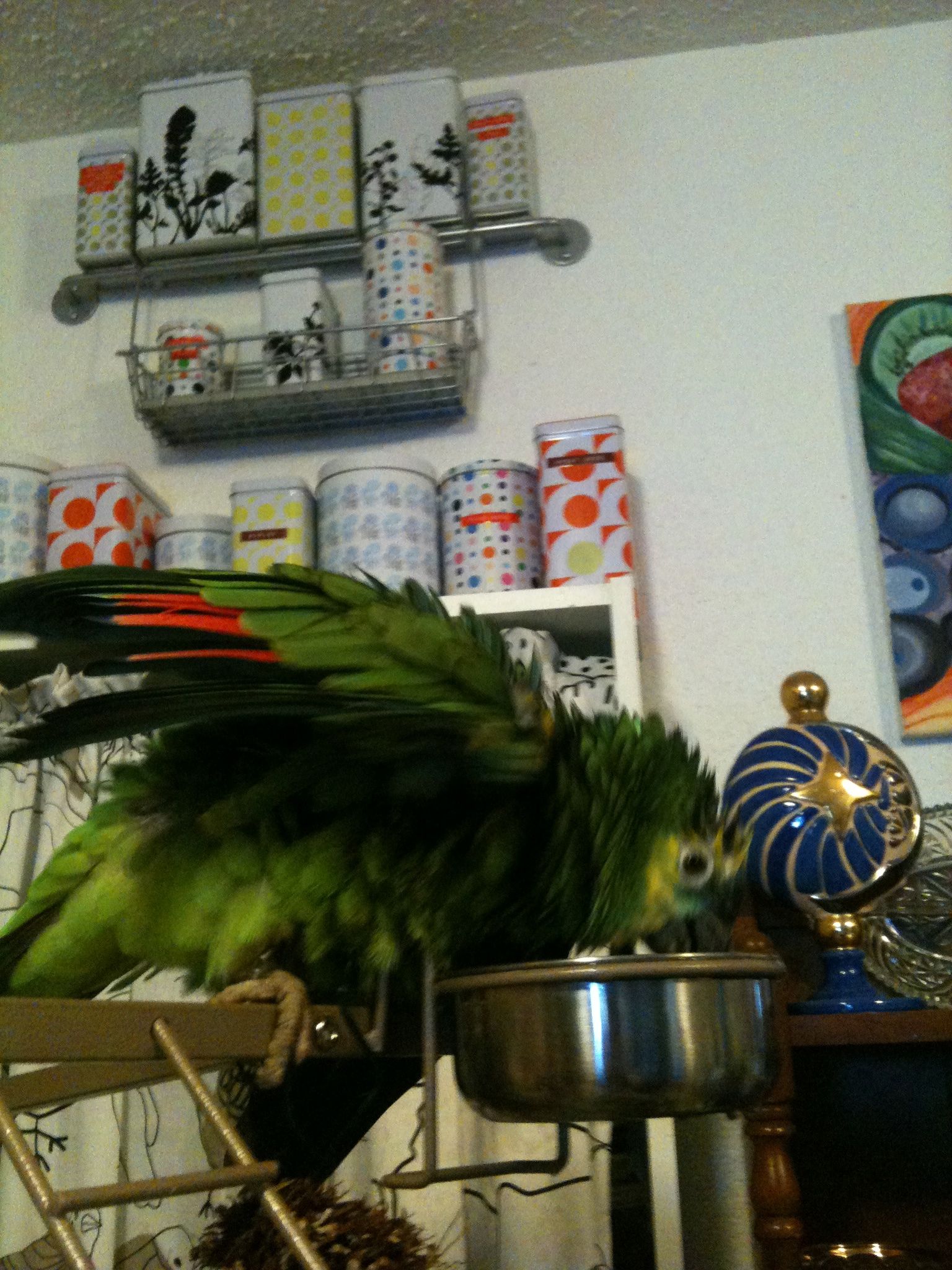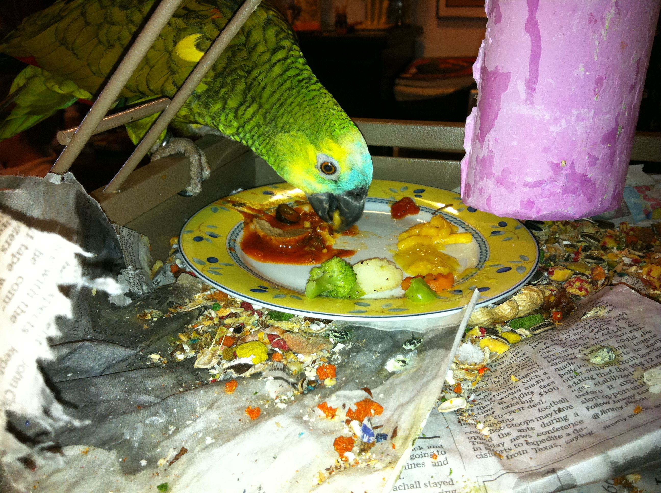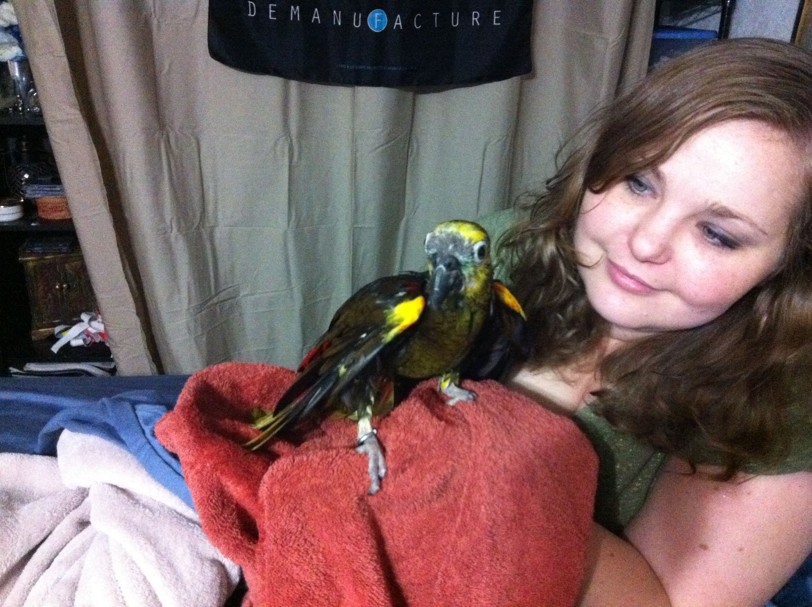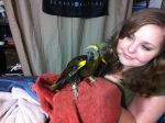 So, not doing any education stuff today, so I thought I would upload pictures of our parrot. Her name is Frankie, and she is a 24-year-old blue-fronted Amazon parrot. She was bought in 1988, and has lived mostly with my wife’s family until we adopted her last year. She doesn’t speak a whole lot, outside of occasionally saying, “I love you” and “hello.” Beyond that, she can make noises that are entertaining and sometimes loud, but compared to a lot of birds I’ve seen, she is quite quiet. She is missing most of her toes on her left foot, so she is not very steady anymore, but she seems to have adapted well. As we’ve had her, she has slowly become my parrot, as I have read they tend to do. They slowly bond with a single family member, unfortunately becoming somewhat hostile to others, so we have to be careful. Anyway, here are a few pictures to tide you over until next time.