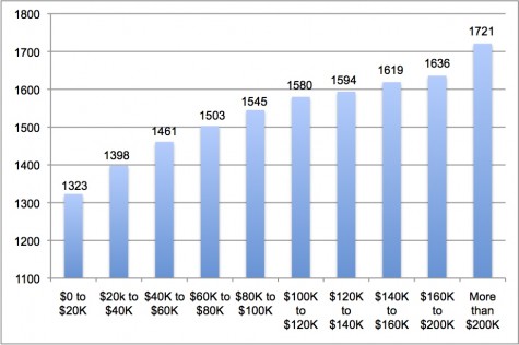 I guess the questions out of this are, what does the SAT really test and what does looking at a standardized test tell us about student progress. The first I learned from a summer of teaching for Princeton Review, which is that the SAT tests you on your ability to take the SAT. That’s about it, since if you know the tricks of taking the SAT, you can do well regardless of your actual knowledge. I can only guess that the fact that SAT scores increase as you go up in income probably reflects the greater availability of SAT prep courses as you go up in income. Or even sadder, maybe it’s that our whole education system is set up to help the richest succeed overall, so what knowledge that is tested on the SAT is more likely to come from the wealthy. On the other side is, of course, the question of how well a standardized test actually measures student ability or progress. Increasingly we come to rely on these high-stakes tests, but do they actually test ability, or do they just test access. In other words, if you are rich and can afford to send your kids to the best private high schools, are you more likely to do well on the SAT tests because of that. I don’t know the answer, but I suspect it’s a combination of all of this.
