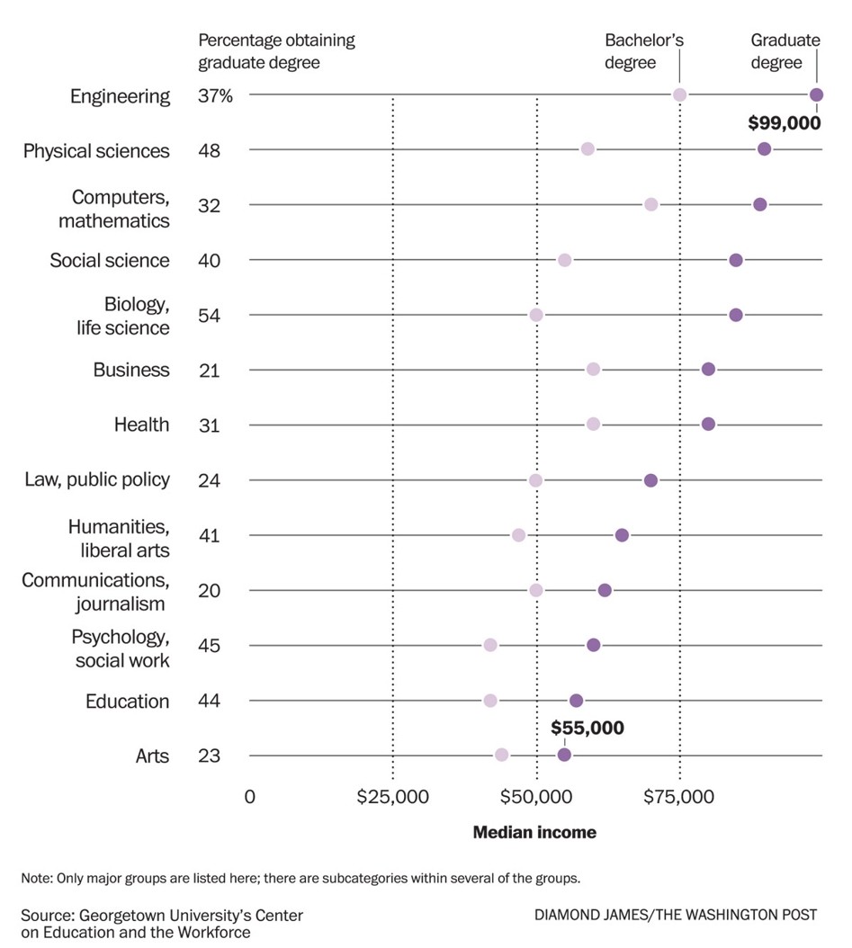 On the theme of a degree telling employers something, this article on the value of a graduate degree is also relevant. As noted, a master’s degree or higher “signals to employers that recipients can complete a demanding program and that they have already been vetted by an institution.” It denotes a set of skills rather than a specific skill. While nothing in this article is particularly groundbreaking, it really just extends the last two I’ve discussed here into the graduate realm. Of course, the value of the graduate degree does vary by field, and I found their graphic to illustrate this well: